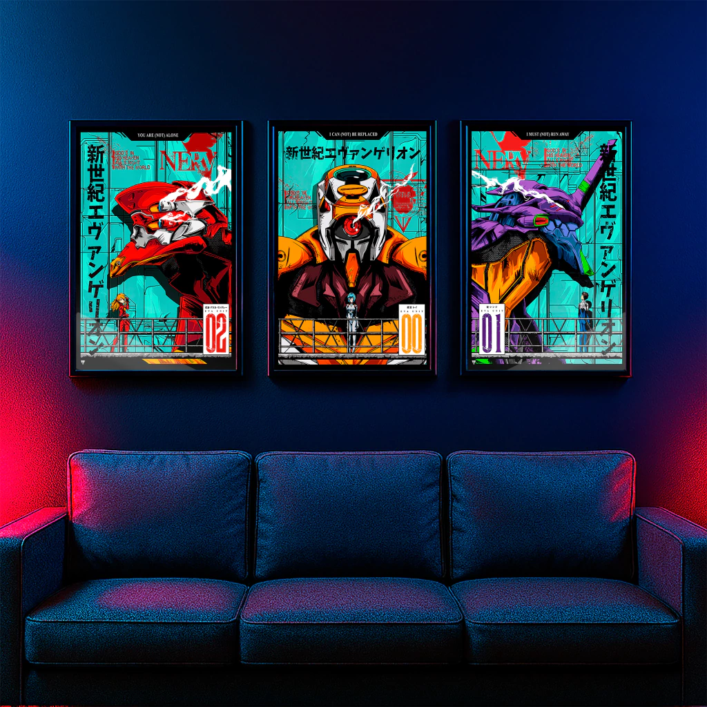 Este bundle incluye 3 cuadros Cosmos L (60×40 cm) en aluminio ultra HD, con ilustraciones imponentes de las Unidades EVA y sus pilotos.